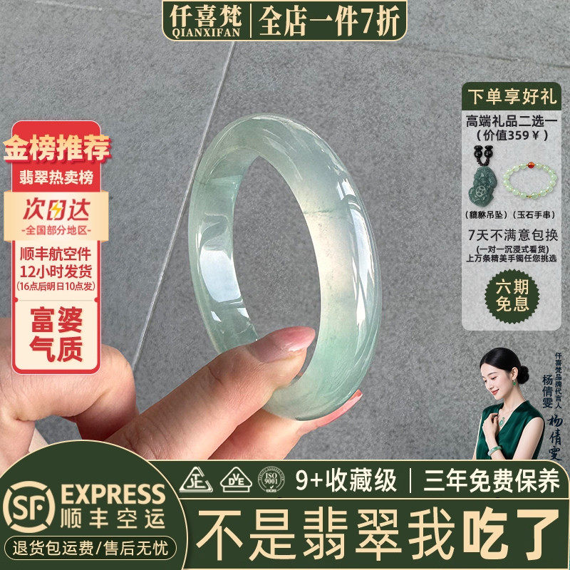 最相物“飘然系列”高冰透缅甸翡翠手镯玉石冰种飘花女真玉手镯子