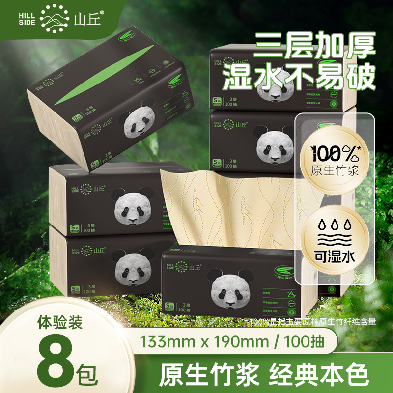 山丘熊猫抽纸家用实惠装抽取式餐巾纸加厚大包3层100抽8包面巾纸