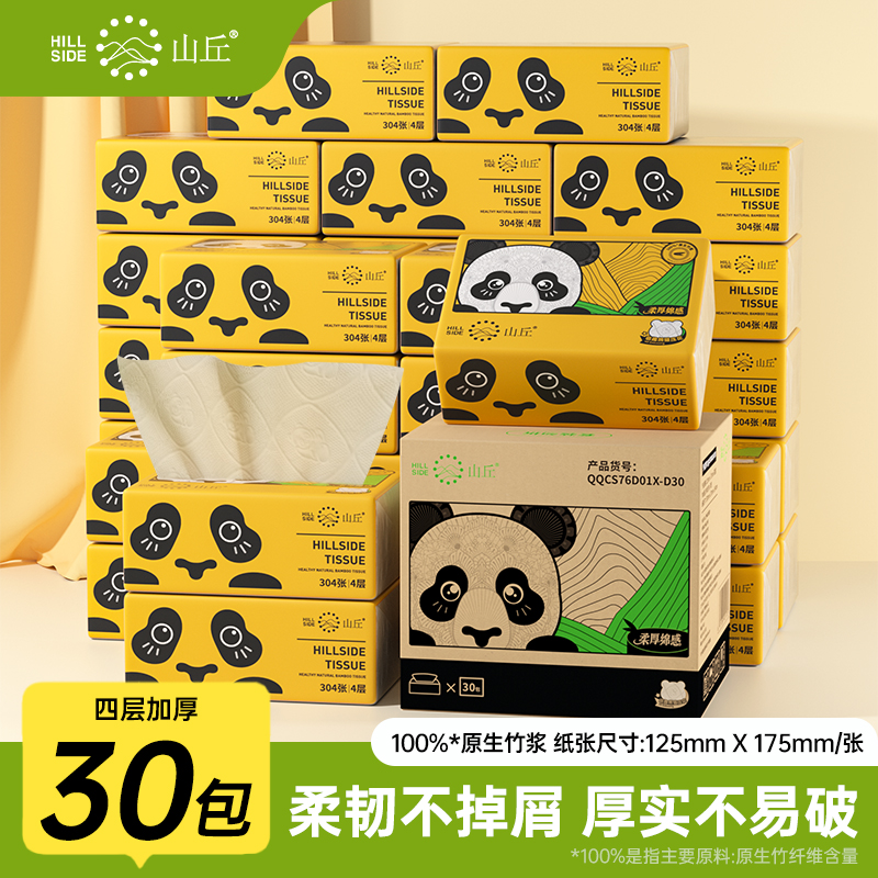 山丘熊猫纸竹浆本色抽取式餐巾纸家用抽纸整箱纸巾加厚4层面巾纸