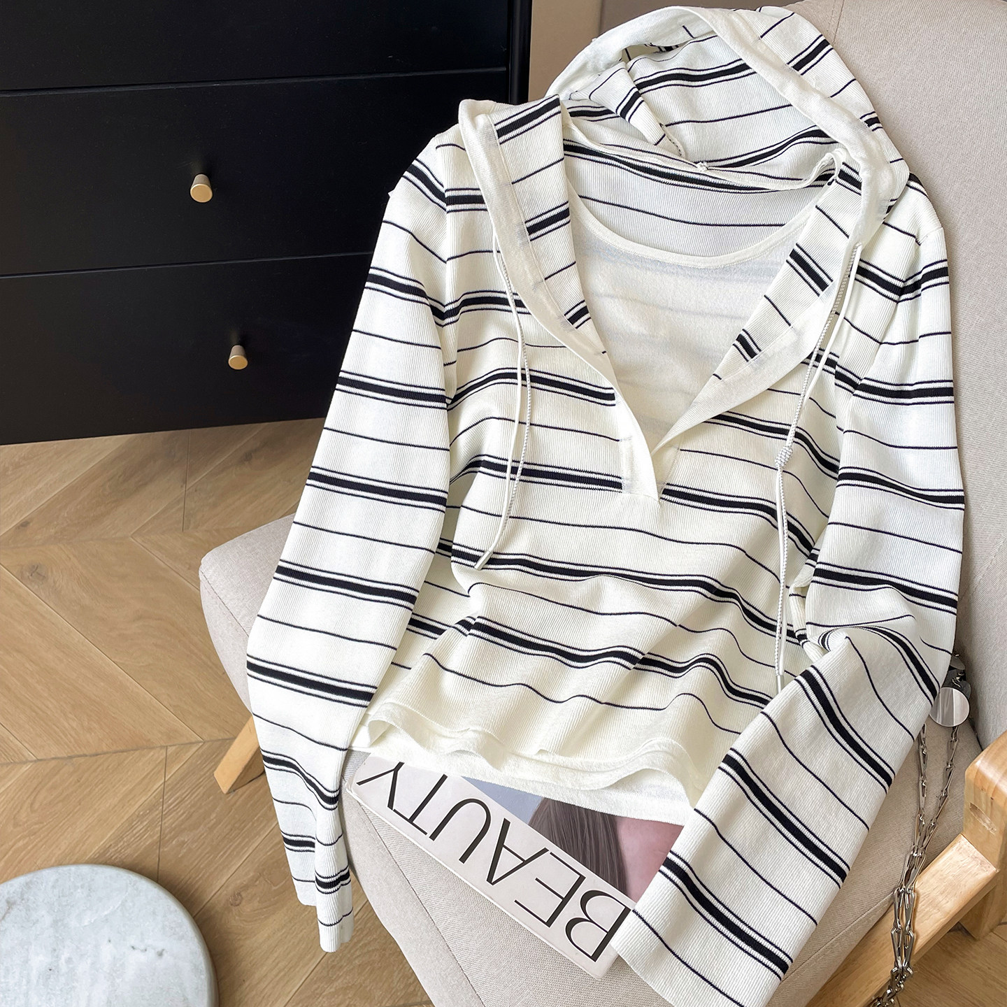 小C家 假两件V领连帽条纹针织衫女2026新款春季韩系穿搭天丝上衣