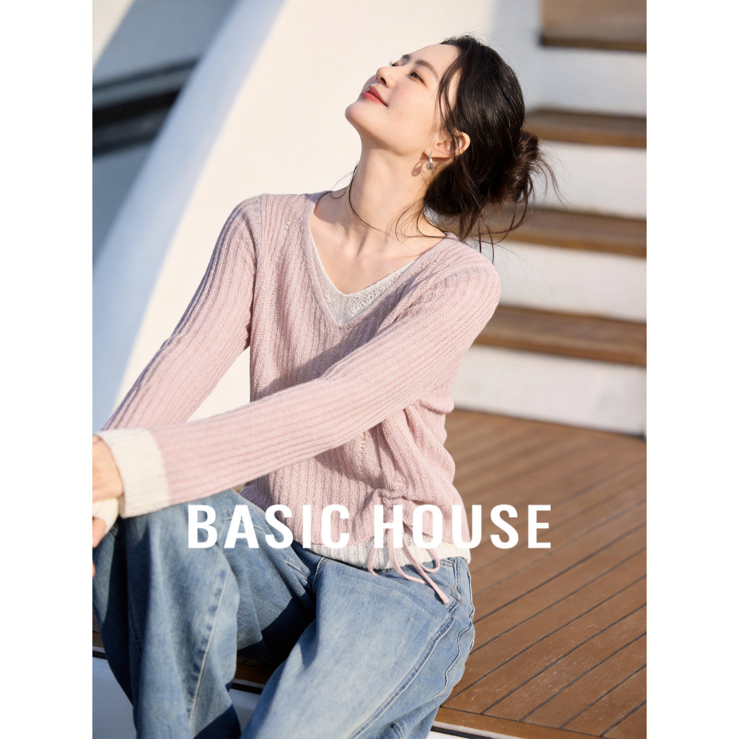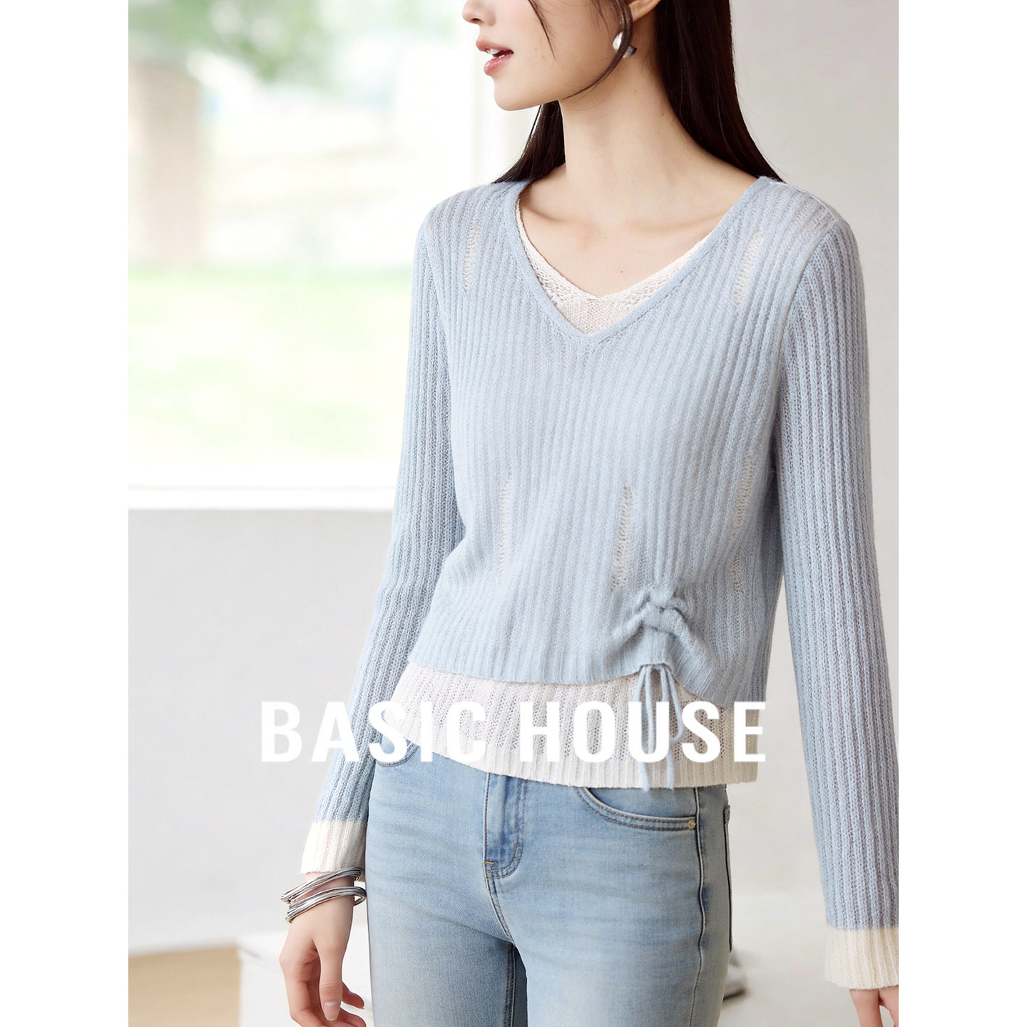 Basic House百家好温柔风假两件抽绳针织衫女春夏V领薄款罩衫上衣