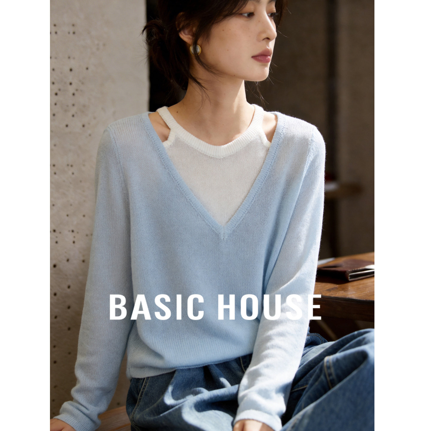 Basic House/百家好韩系温柔风假两件针织衫女宽松显瘦通勤小上衣