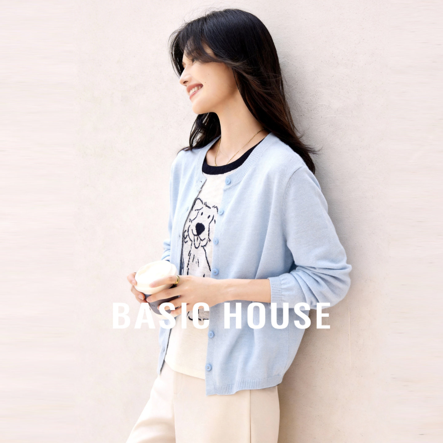 Basic House/百家好撞色假两件针织开衫女2026春夏坑条长袖上衣