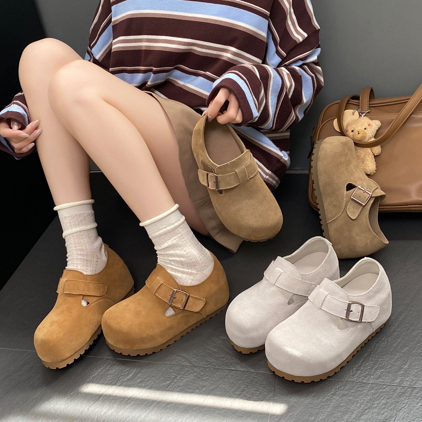 复古厚底勃肯鞋女休闲全包牛反绒内增高新款文艺一脚蹬单鞋博肯鞋