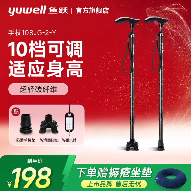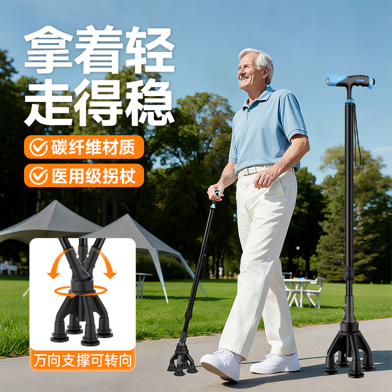 邦山碳纤维拐杖老人防滑大四脚超轻可伸缩老年人拐棍轻便徒步手杖