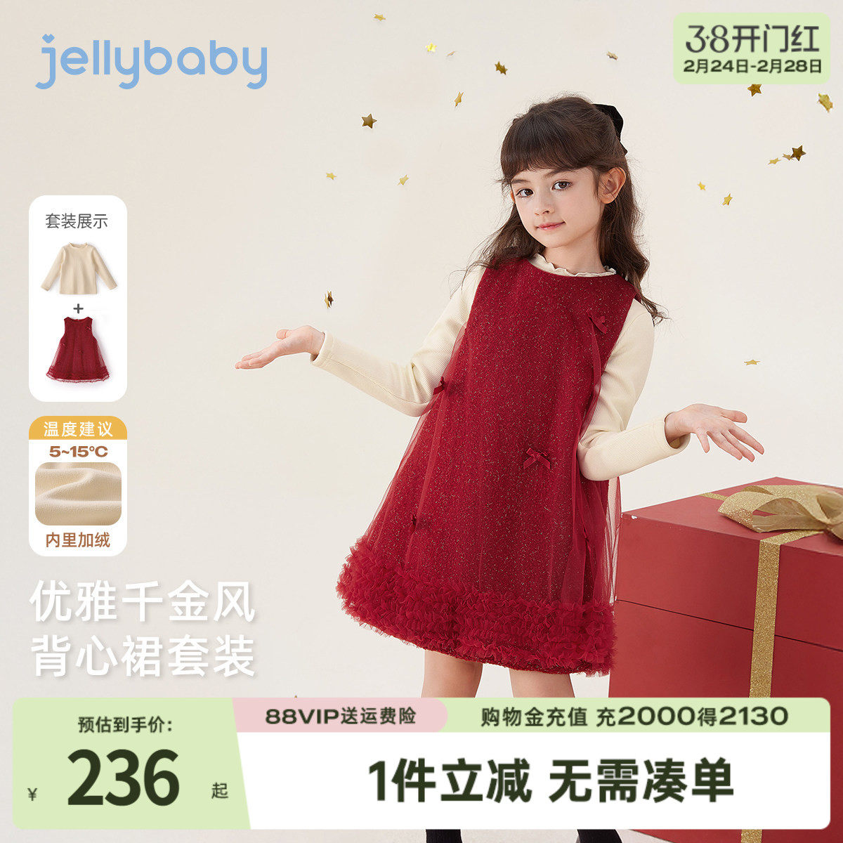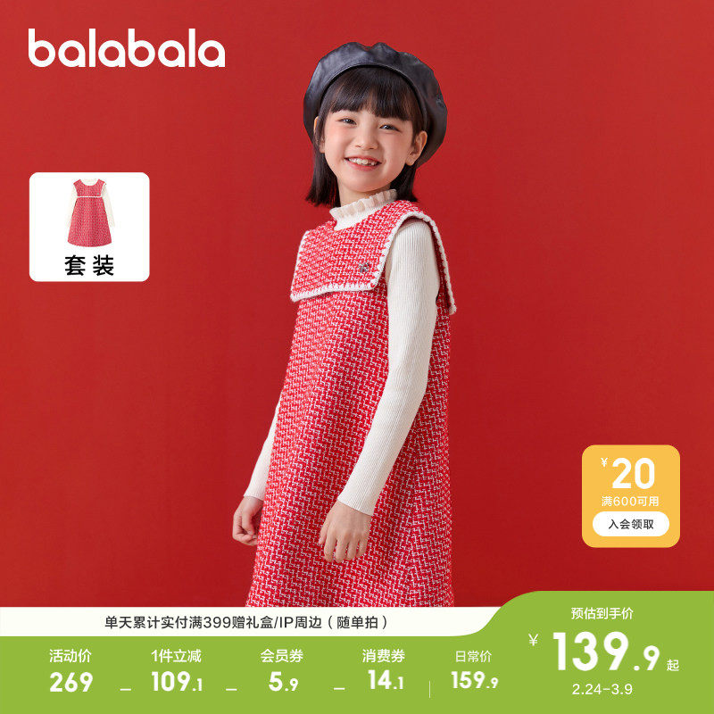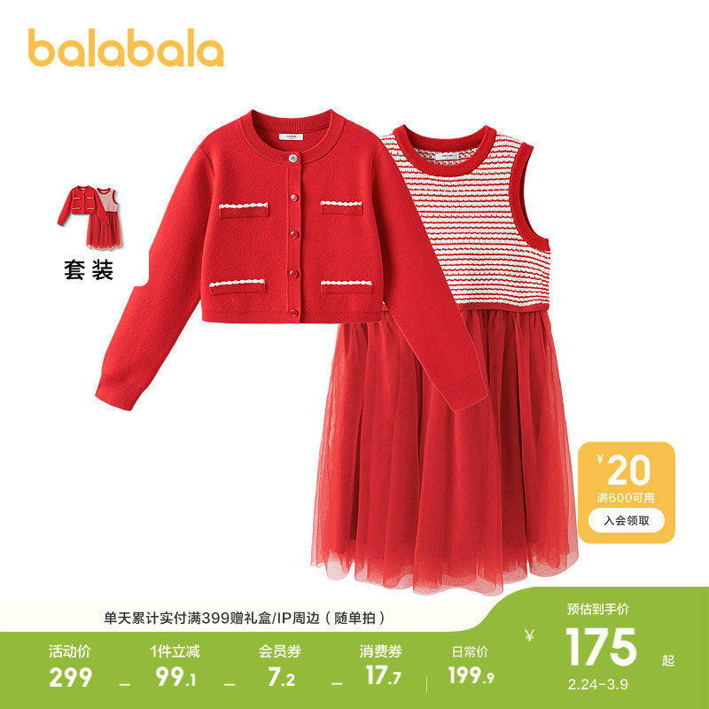 巴拉巴拉童装女连衣裙儿童裙子针织网纱春秋装红色拜年服两件套装