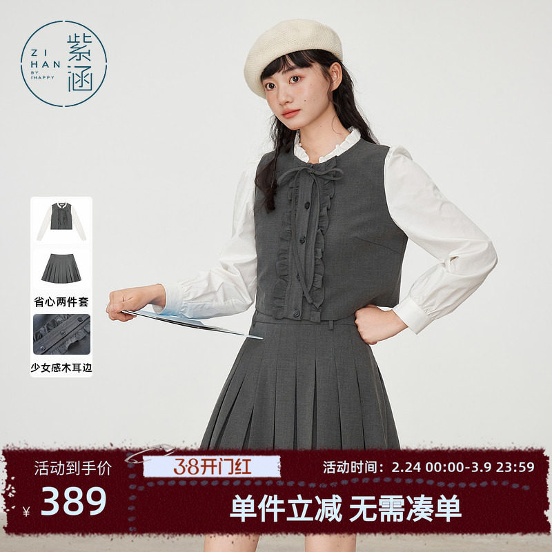 紫涵木耳边假两件拼接长袖衬衫a字百褶短裙两件套装女春秋季新款