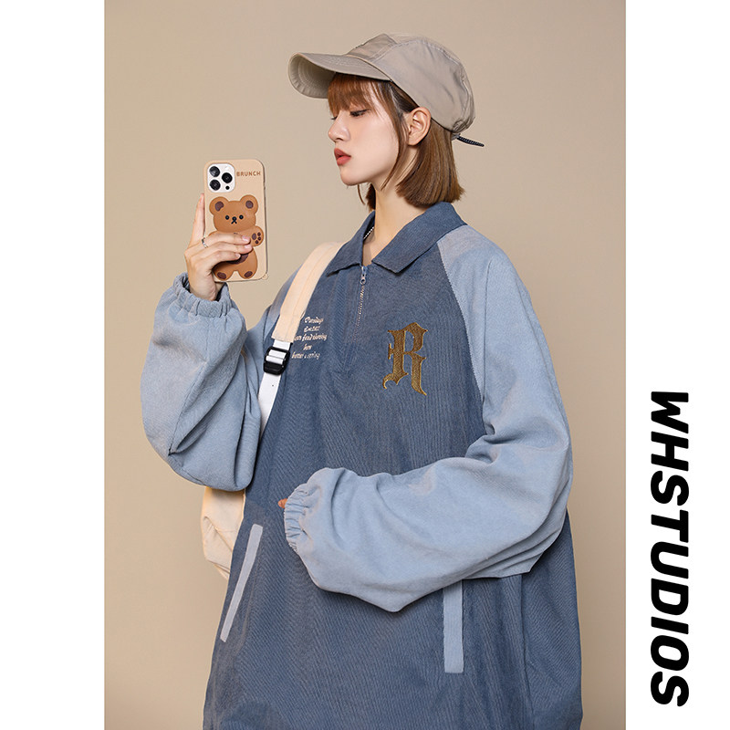【满两件包邮】2025春季新款港风青少年学生灯芯绒拼接卫衣外套潮