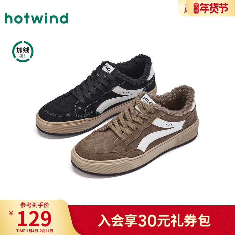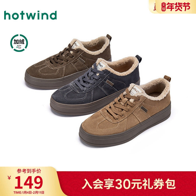 热风男鞋2025年冬季新款加绒复古板鞋百搭增高休闲鞋棕色德训鞋子