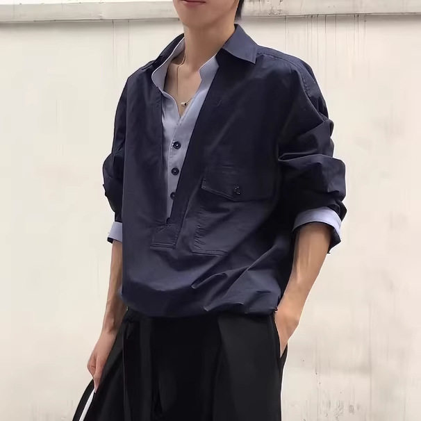 高档中领简约斜V领纯色半高领纯棉长袖t恤男装潮牌男女同款打底衫