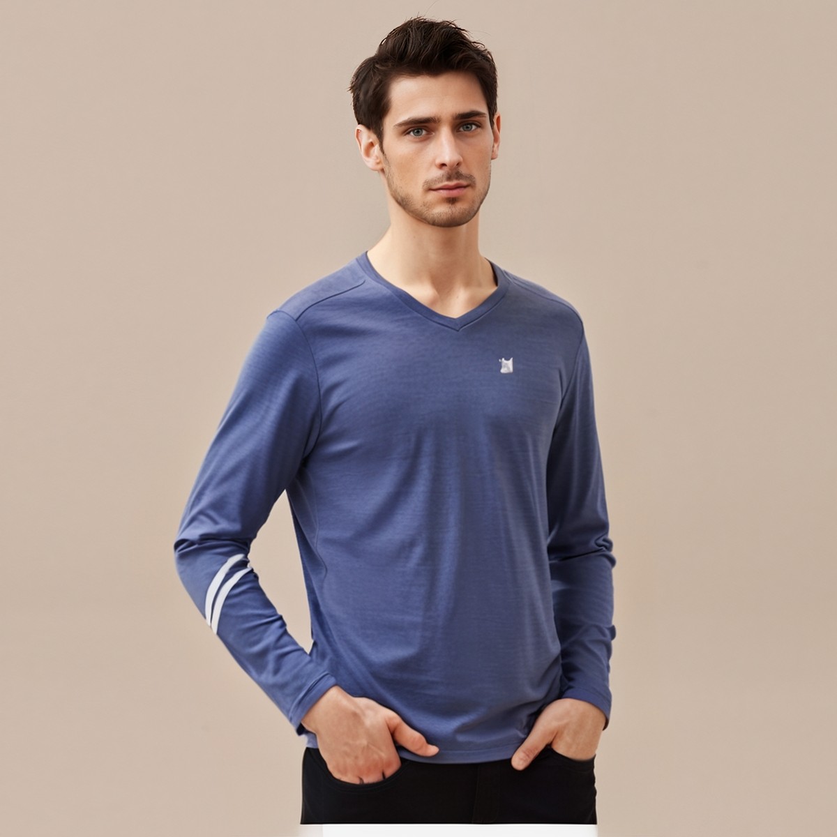 日单高弹轻柔薄款束袖吸湿发热男V领长袖38%绢丝5%氨纶色拉姆体恤
