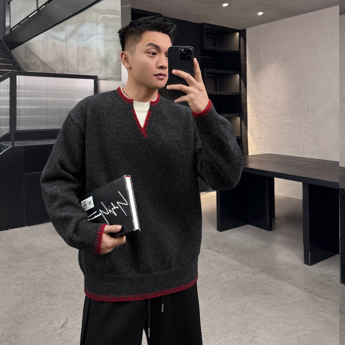 二十二号穿搭羊毛混纺拼色V领毛衣男士冬季长袖保暖假两件针织衫