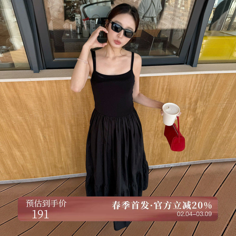 AIRIQI春季新款方领高腰A字拼接压褶设计感吊带连衣裙女AY51LQ326