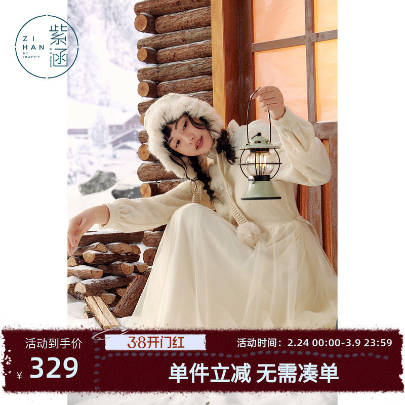 紫涵针织拼接网纱连衣裙女冬季新款设计感羊毛提花收腰显瘦a字裙