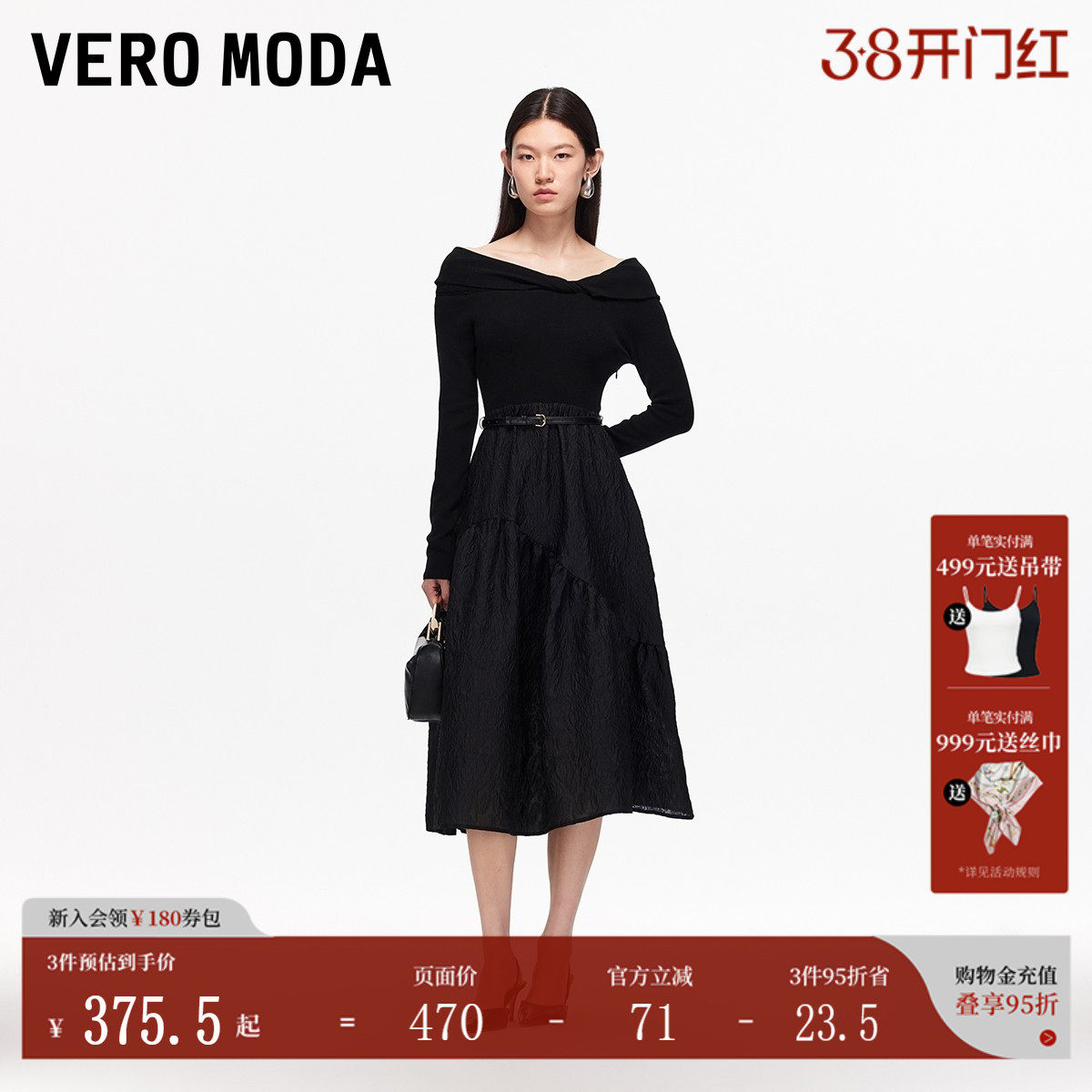 Vero Moda连衣裙2025秋季新款一字肩腰带拼接A字针织裙优雅淑女风