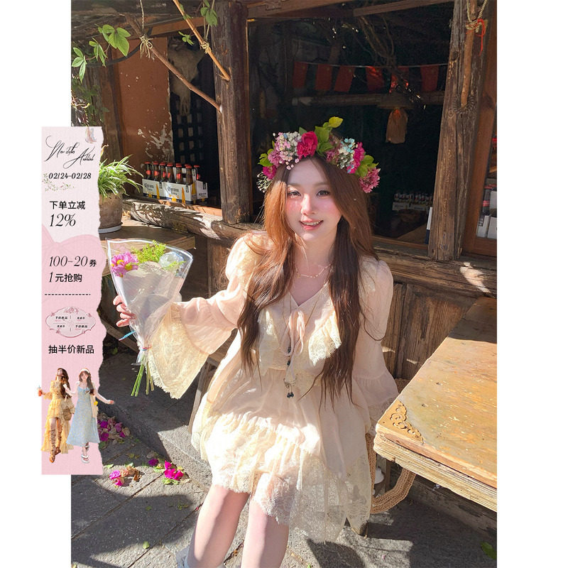 安妮不火荷叶边蕾丝拼接V领雪纺A字连衣裙微胖大码法式收腰少女裙