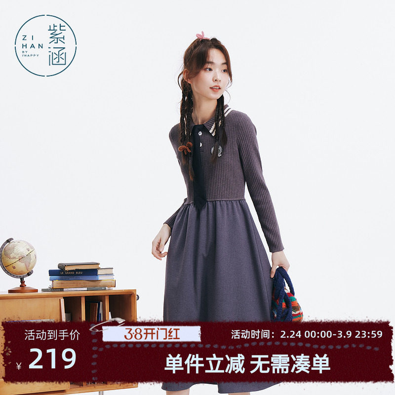 紫涵polo领针织拼接连衣裙女冬季新款学院风灰色收腰休闲a字裙子