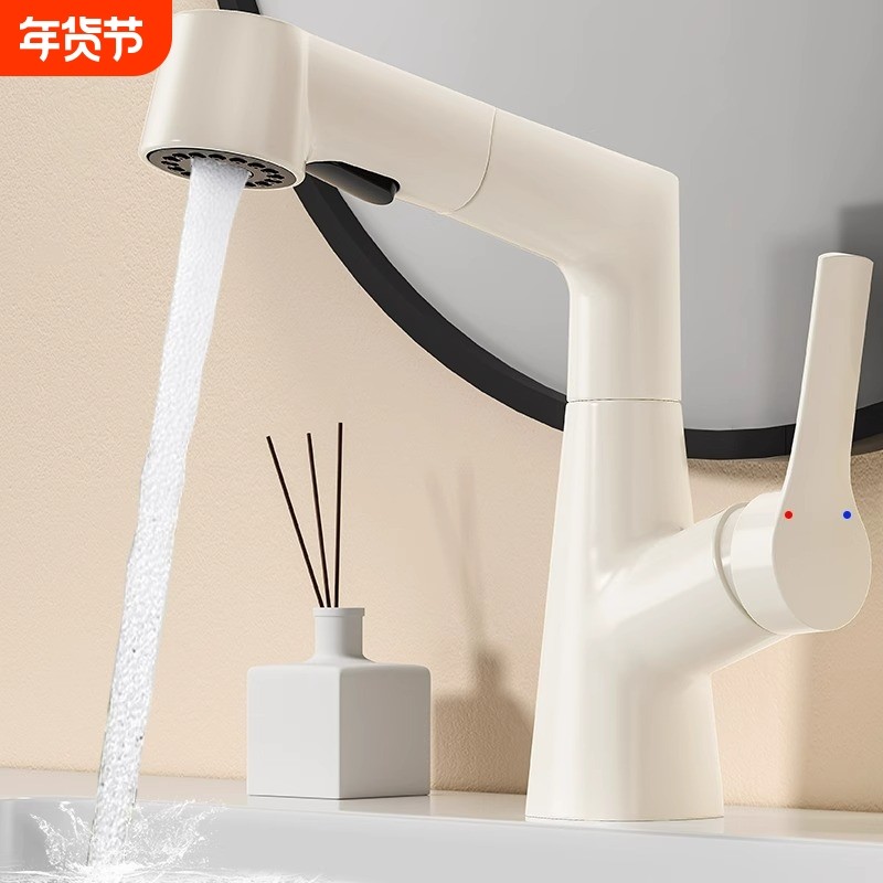 当代法式全铜面盆抽拉龙头奶白冷热水龙头旋转浴室洗脸台下盆龙头