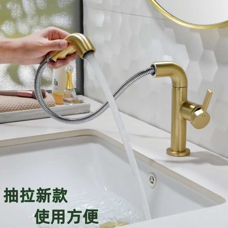 全铜面盆抽拉龙头浴室家用台盆抽拉冷热水龙头上出水抽拉面盆龙头