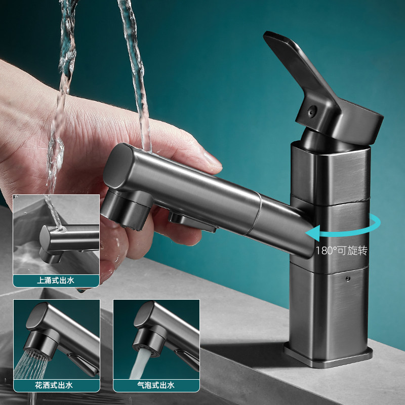 德国枪灰色面盆抽拉龙头冷热水铜浴室柜洗脸盆台下盆上喷漱口龙头