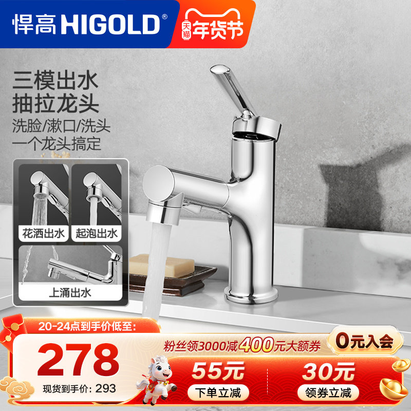 悍高浴室面盆抽拉龙头冷热三功能出水脸盆龙头卫生间台盆卫浴龙头