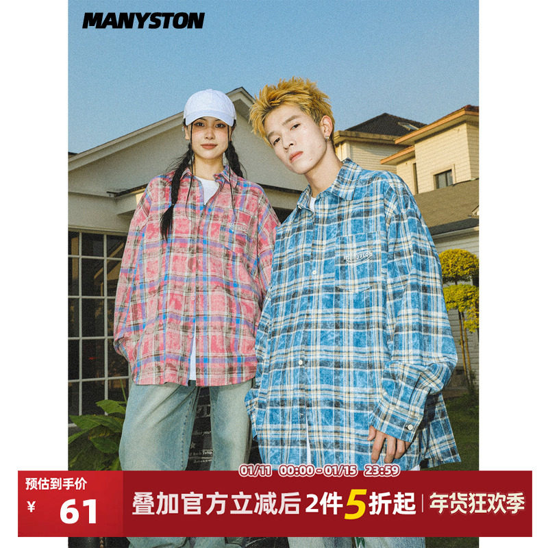 方逸伦同款MANYSTON美式痞帅休闲格子衬衫男春秋纯棉长袖衬衣外套