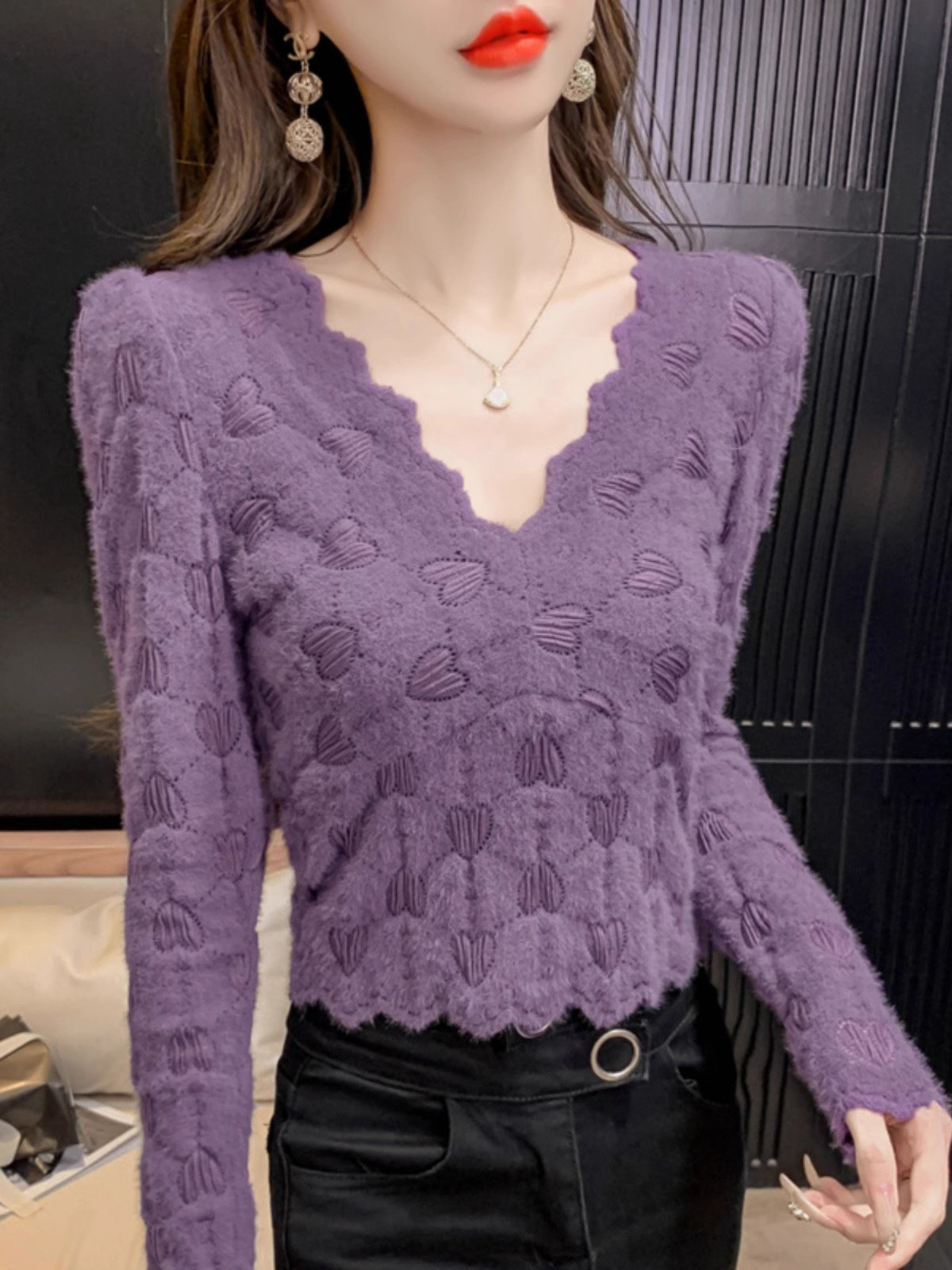 春秋V领打底蕾丝衫女2024冬季新款韩版气质磨毛泡泡袖蕾丝上衣潮