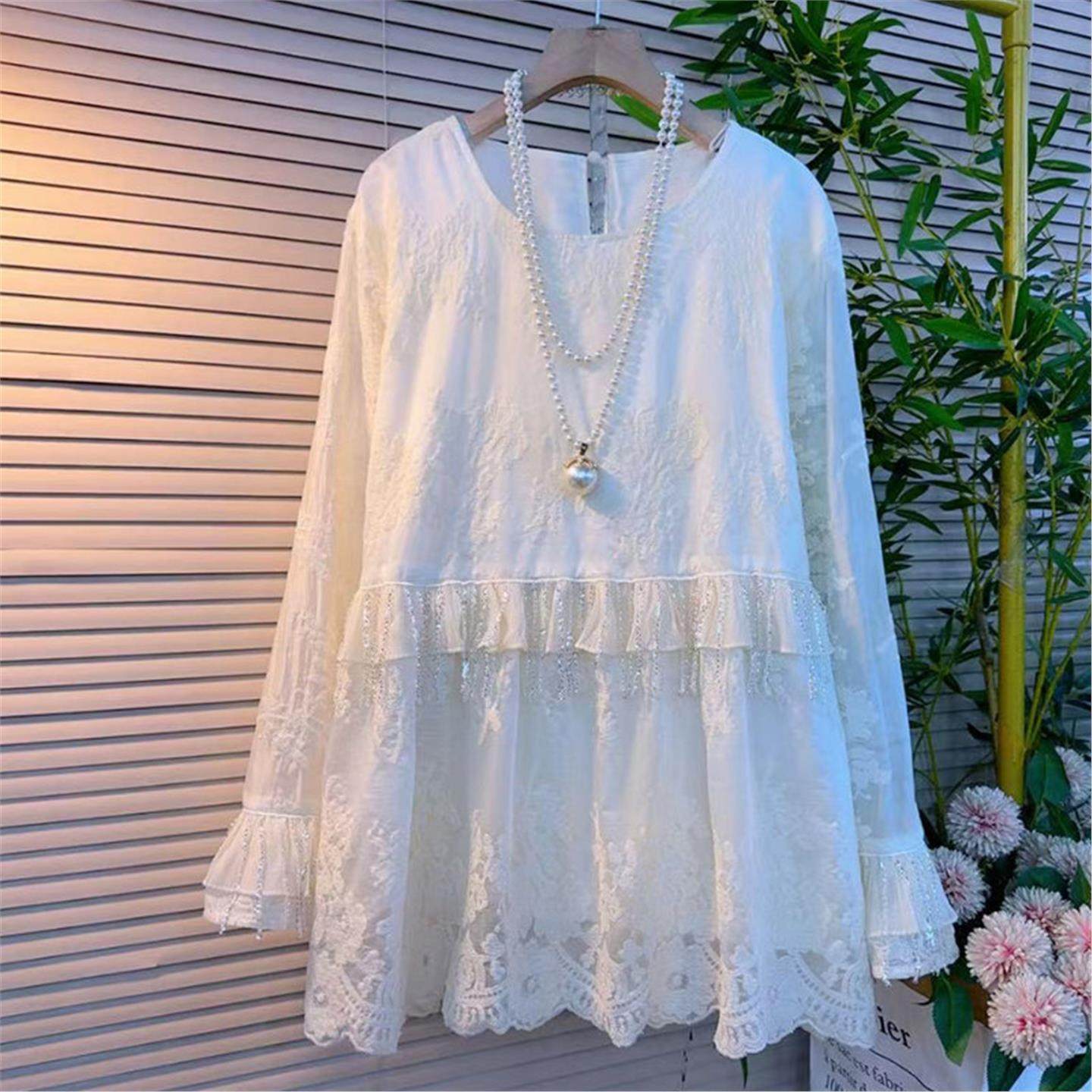法式钩花镂空喇叭袖蕾丝衫女夏季大码胖mm超好看外搭防晒罩衫上衣