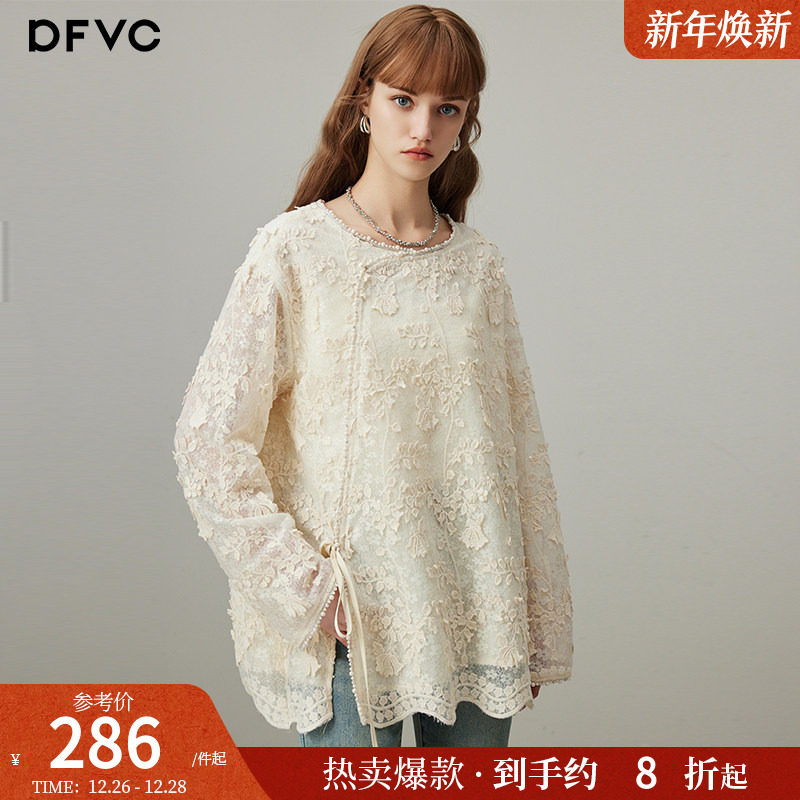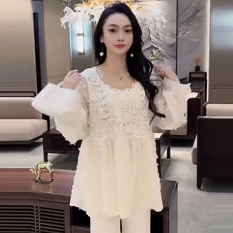 dfvc新中式国风蕾丝衫女2025年秋季新款钉珠刺绣长袖衬衣打底衫