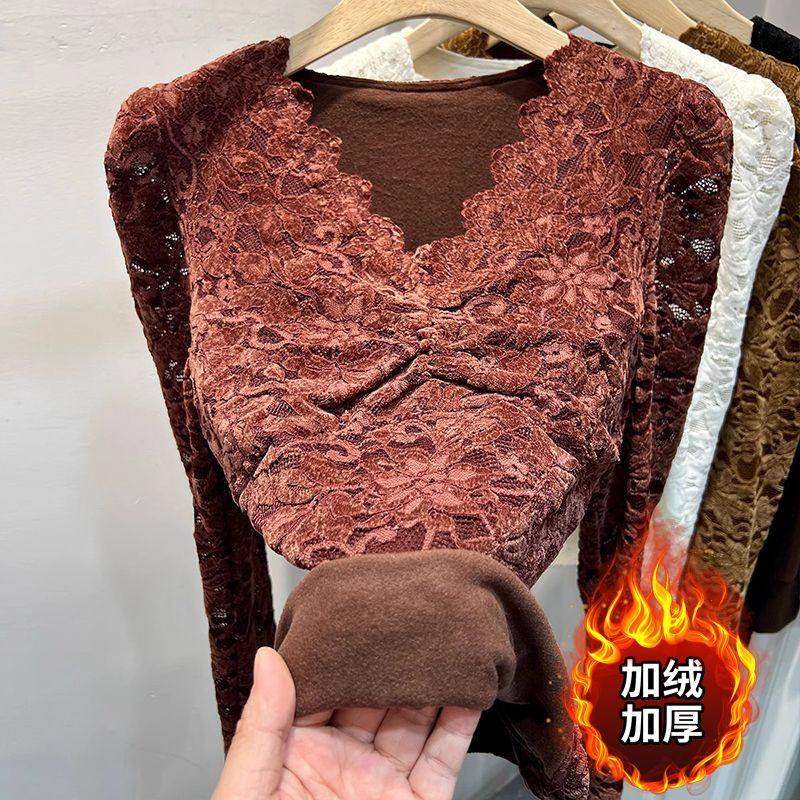 洋气高级感小衫2025年秋冬新款内搭加绒v领蕾丝衫女打底保暖上衣