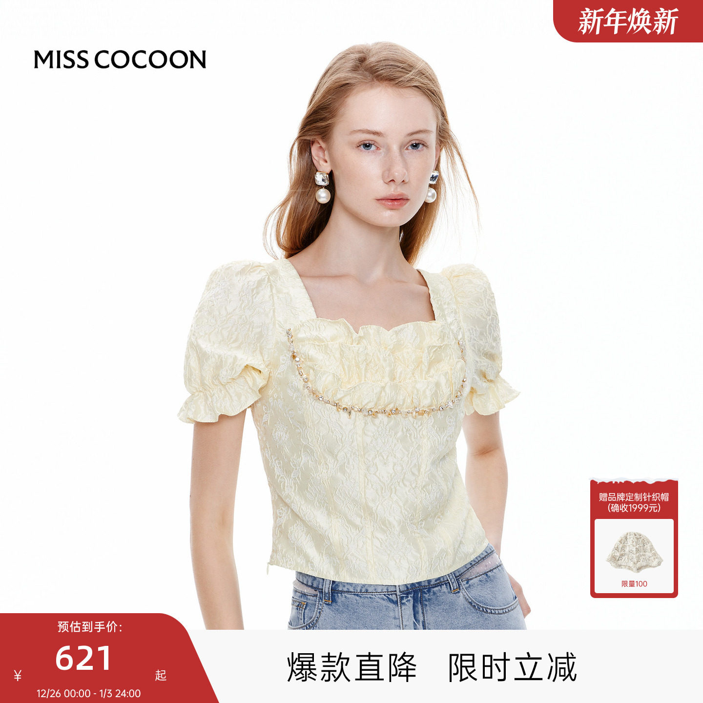 MISS COCOON可可尼层叠蕾丝衫女2025秋季新款黄色短袖泡泡袖上衣
