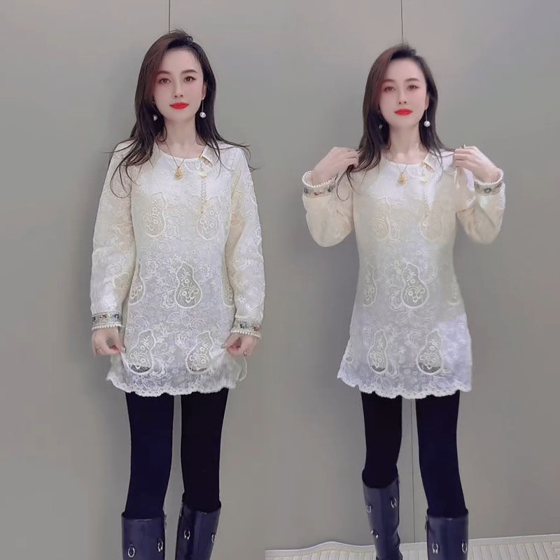 国风中式减龄洋气蕾丝衫女2025秋冬新款重工时尚百搭圆领刺绣上衣