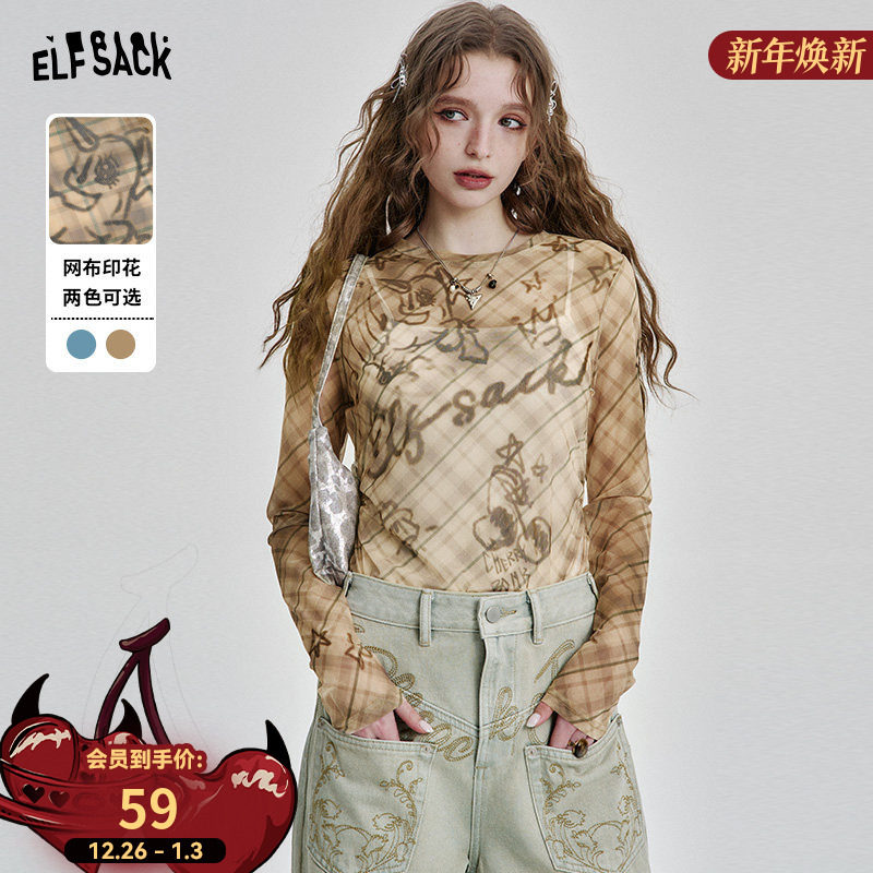 妖精的口袋原创满印修身蕾丝衫女2025年秋季新款内搭叠穿罩衫上衣
