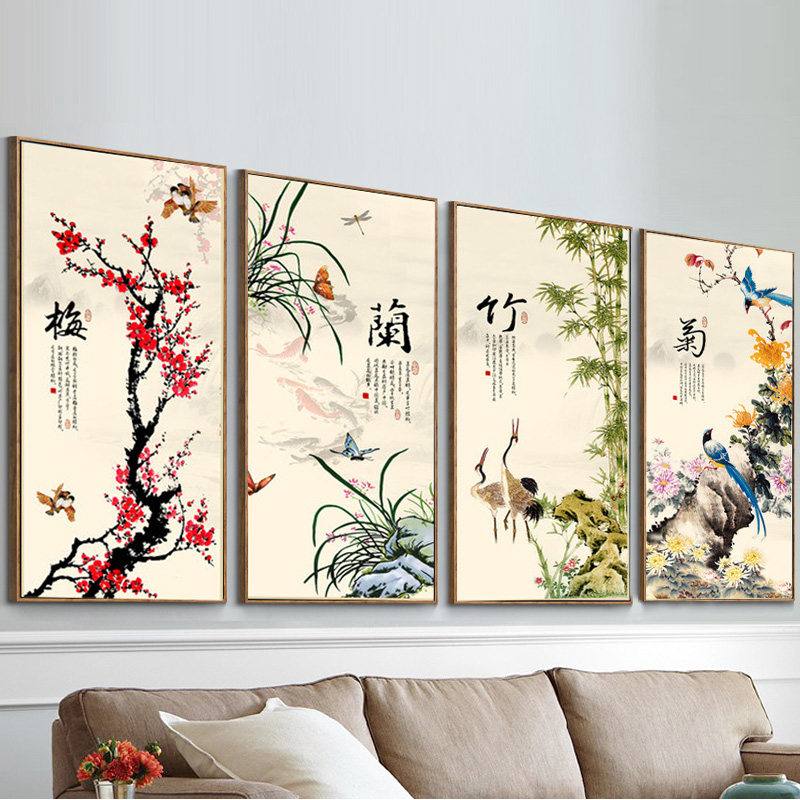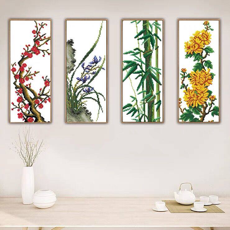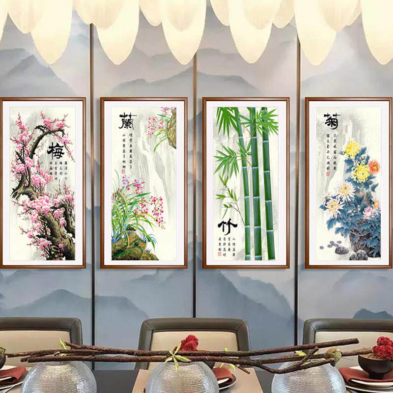 青飞3D梅兰竹菊竖版十字绣四君子四联画鸟语花香水墨书房有钻石画