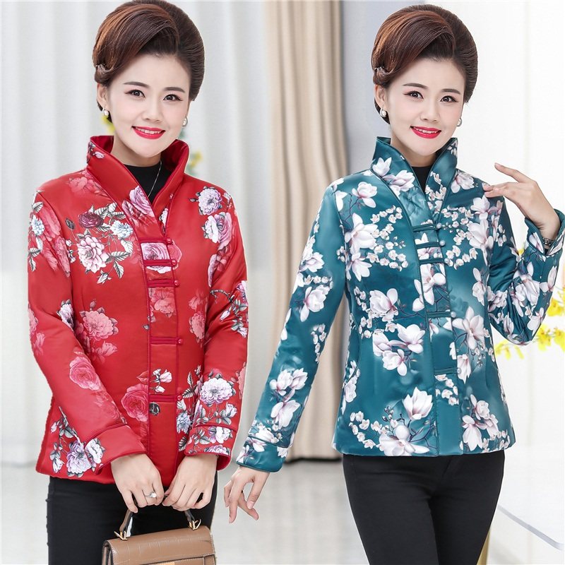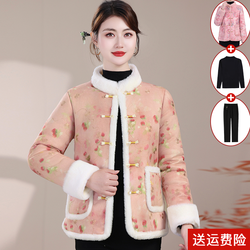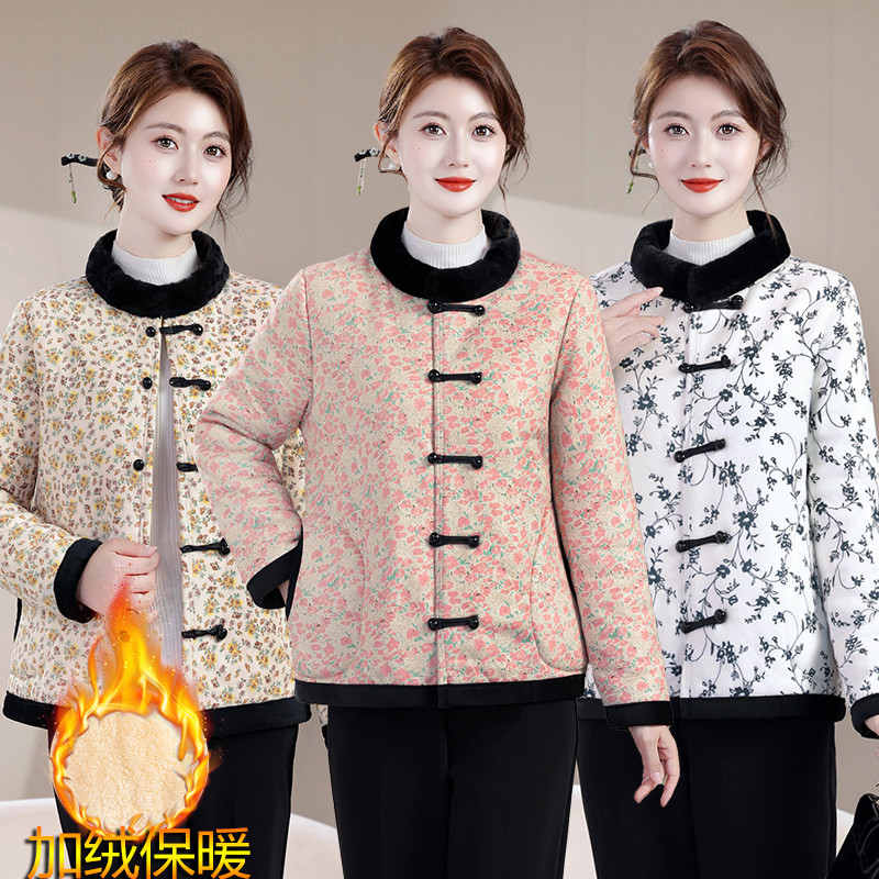中年女加绒加厚国风碎花棉袄妈妈秋冬季新款中式盘口唐装棉衣外套