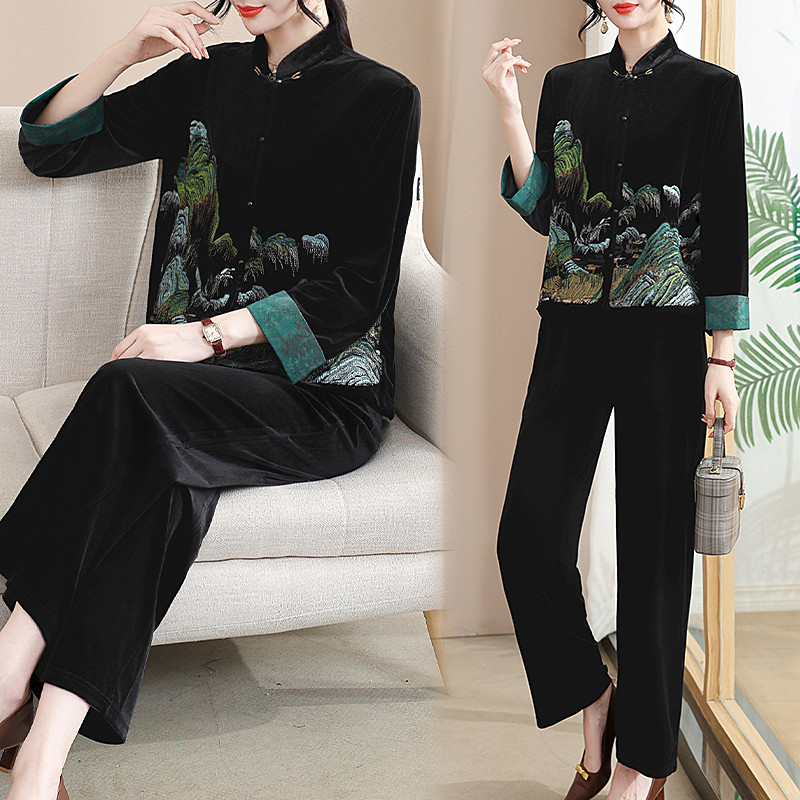 中年妈妈秋装新中式国风金丝绒唐装中老年女2024秋季新款两件套装