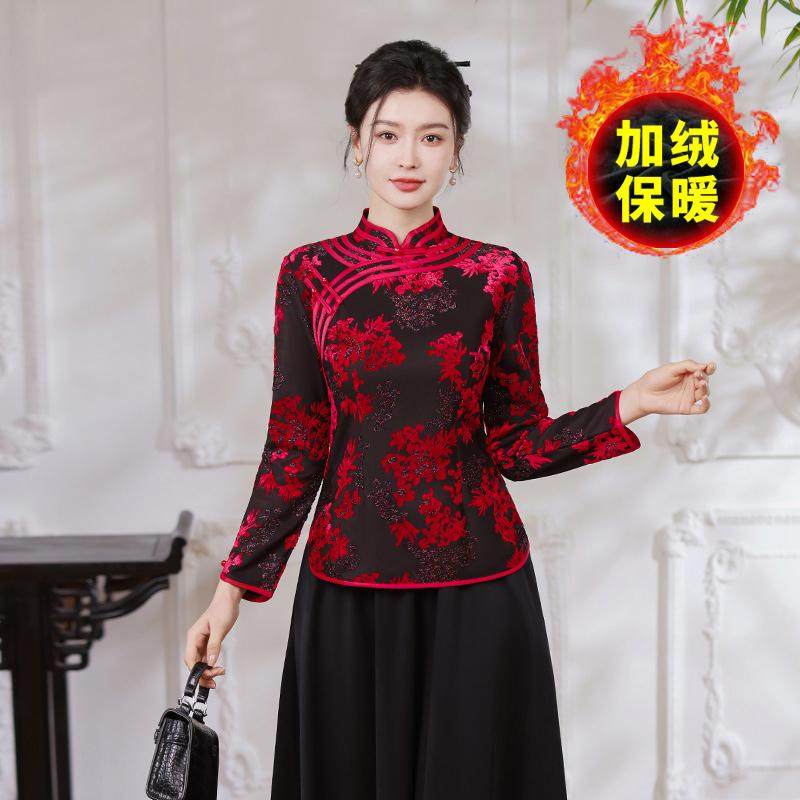 中年女冬装打底衫加绒加厚改良旗袍上衣高贵洋气中式国风保暖唐装