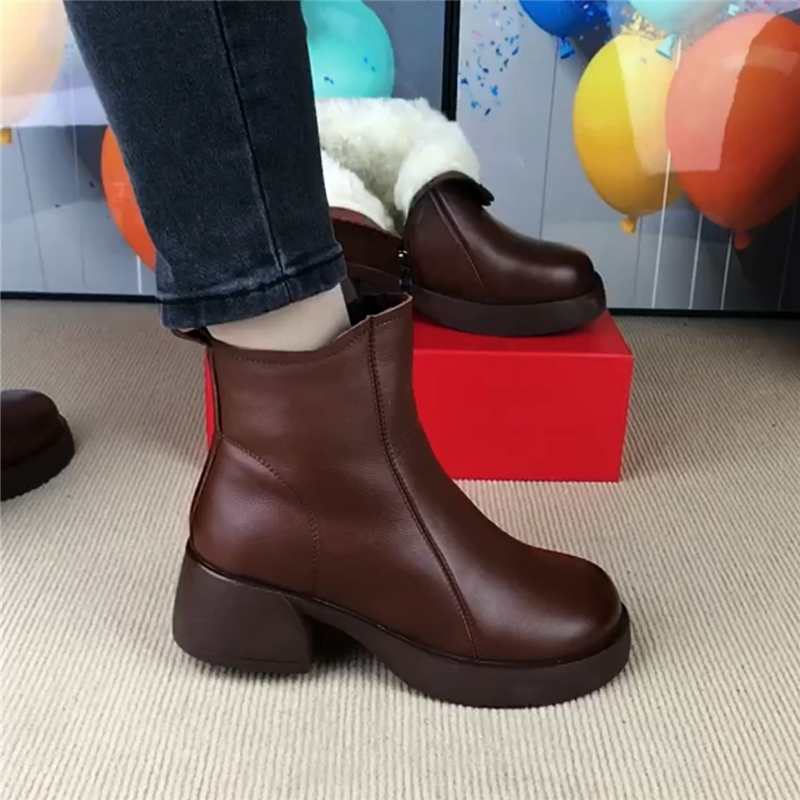 短靴女真皮圆头粗跟羊毛靴子复古棉鞋女冬加绒侧拉链软底马丁靴女