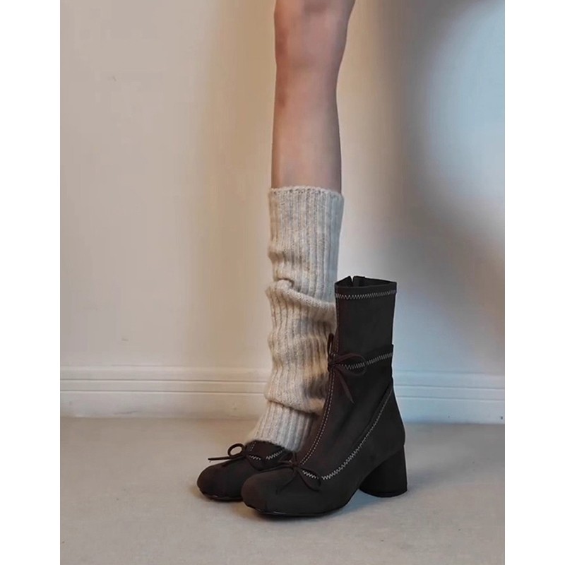 牛皮版~复古蝴蝶结芭蕾风弹力瘦瘦靴女圆头绒面粗跟侧拉链小短靴