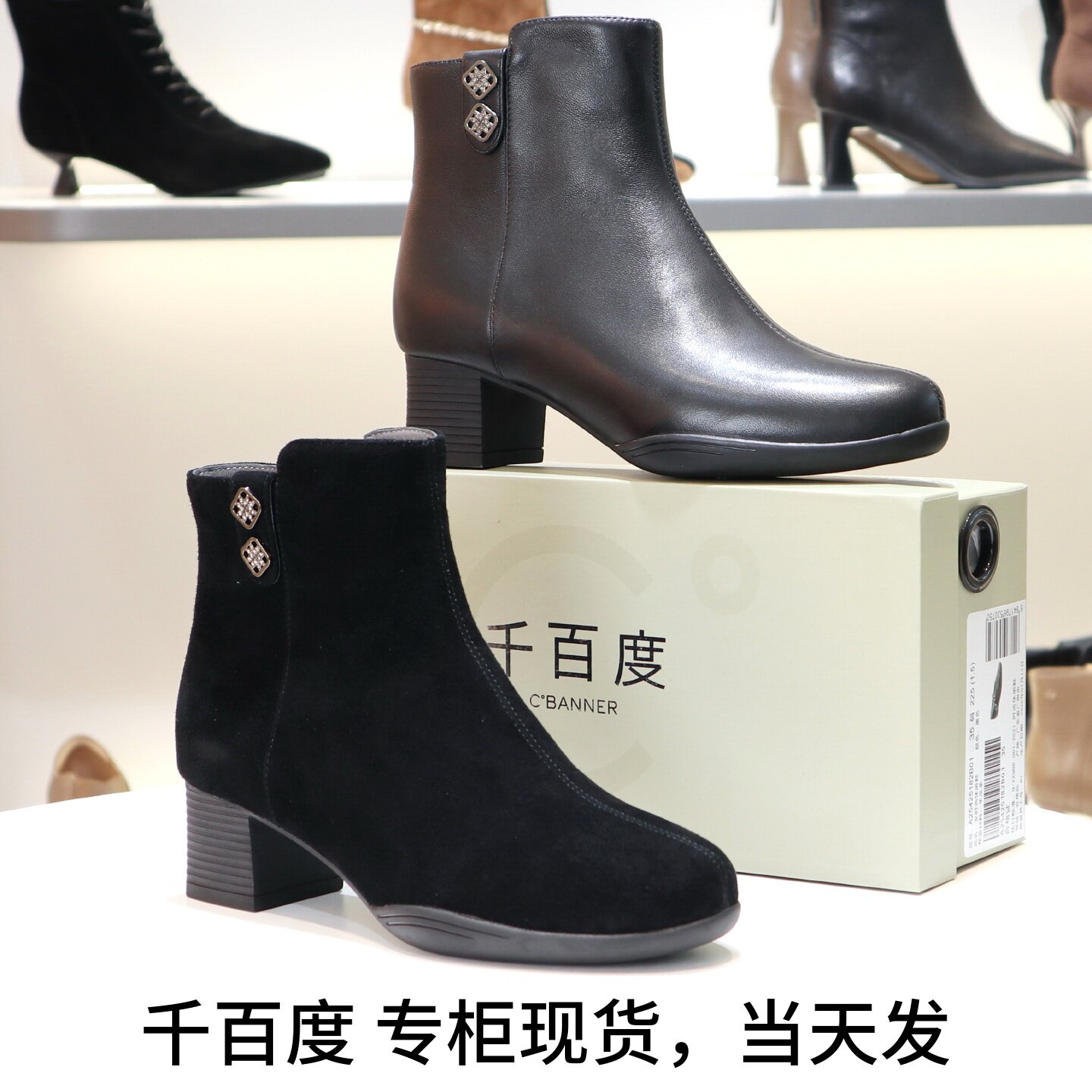 千百度2025羊皮粗跟圆头侧拉链裸靴黑色女靴短靴子A25510812A01