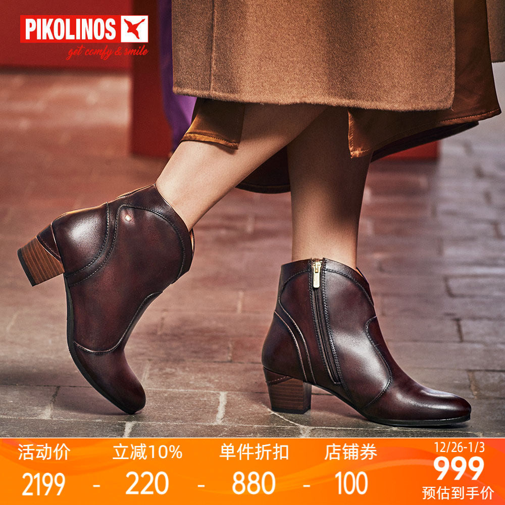 Pikolinos派高雁冬季牛皮圆头粗跟拼色侧拉链短靴PA230721