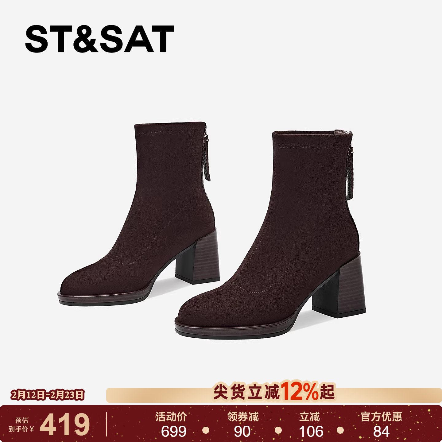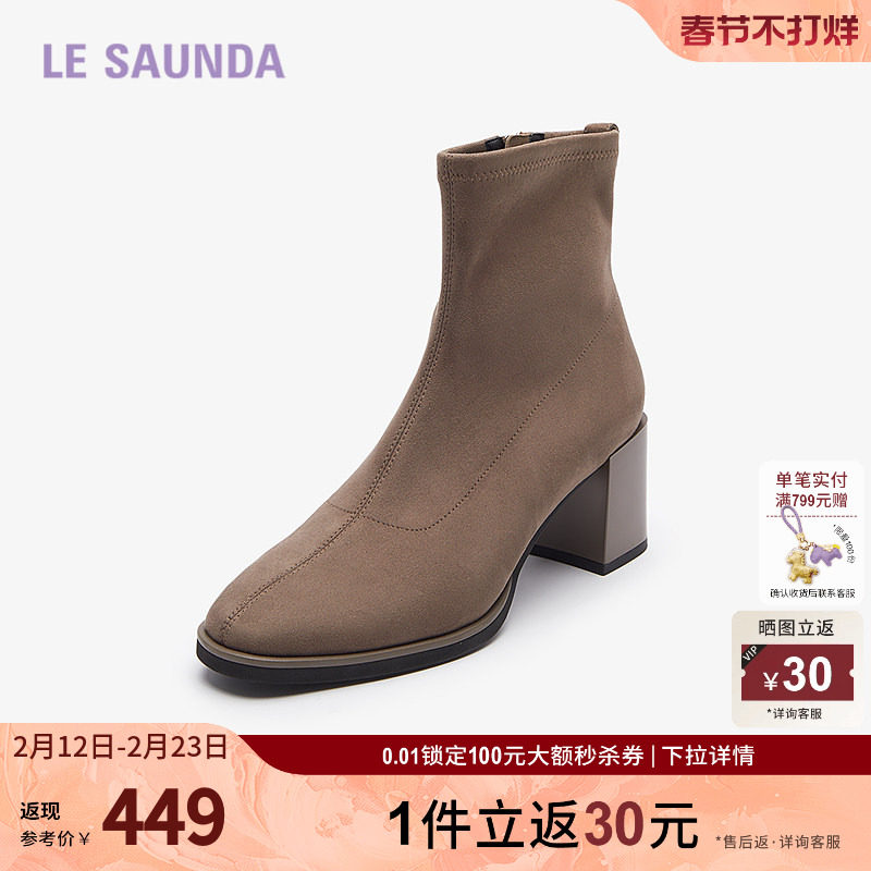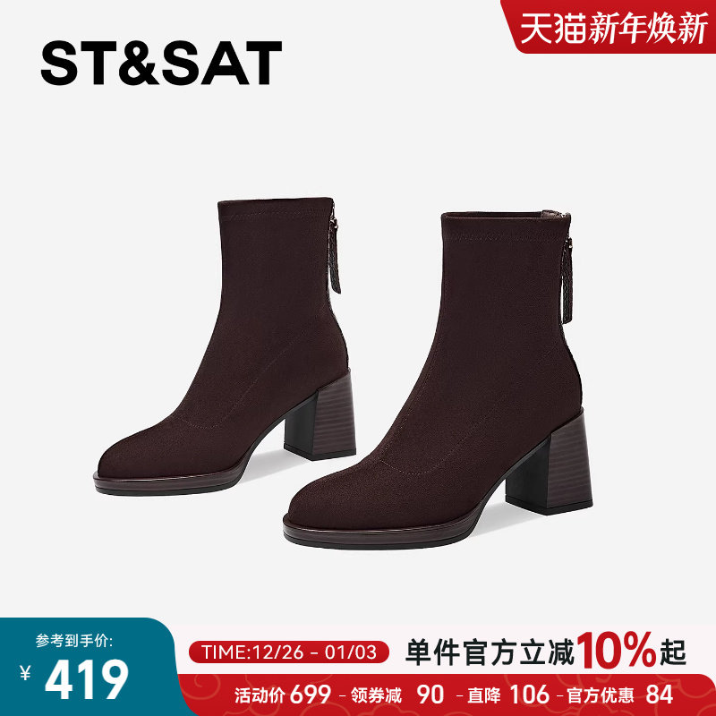星期六棕色短靴女2025秋冬圆头粗跟百搭弹力靴后拉链短筒高跟女靴