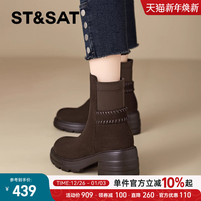 星期六短靴女英伦风圆头侧拉链2025年新款秋冬粗跟厚底百搭时装靴