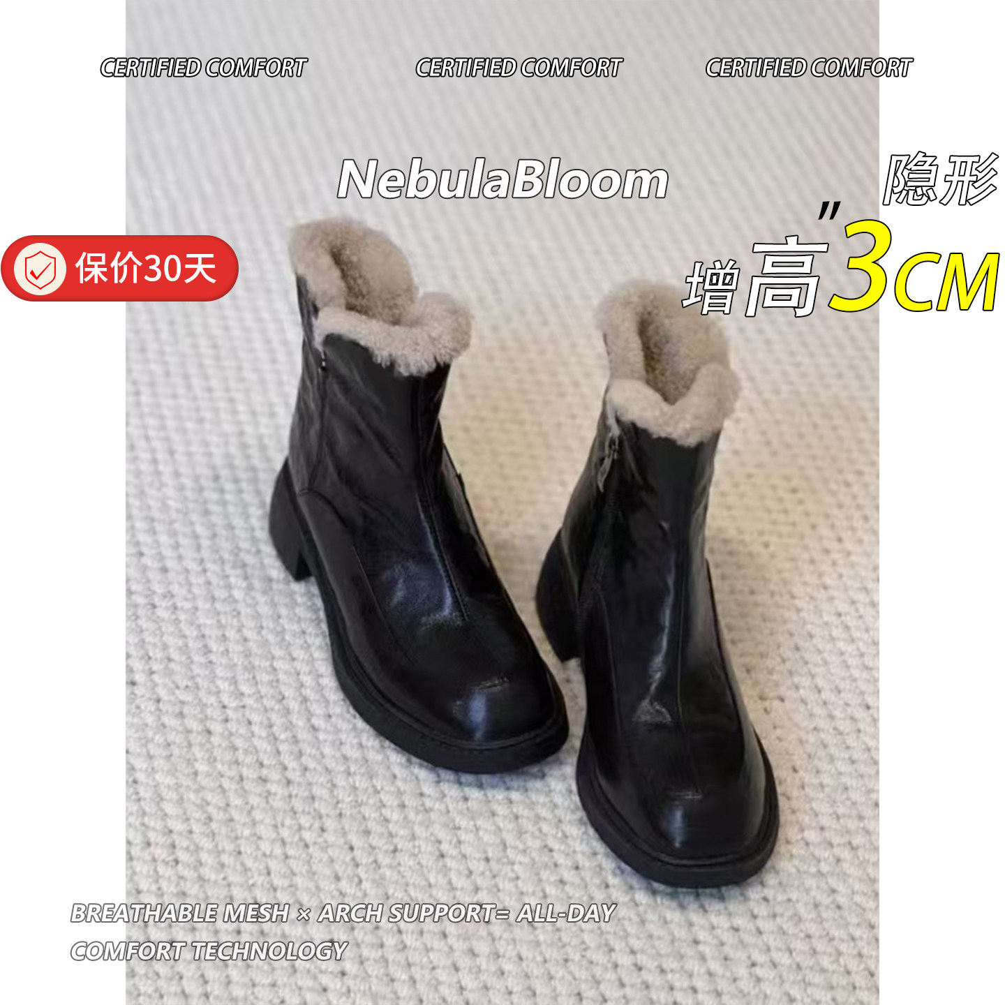 羊毛版~韩系圆头粗跟加绒短靴女秋冬新款侧拉链毛毛马丁靴瘦瘦靴