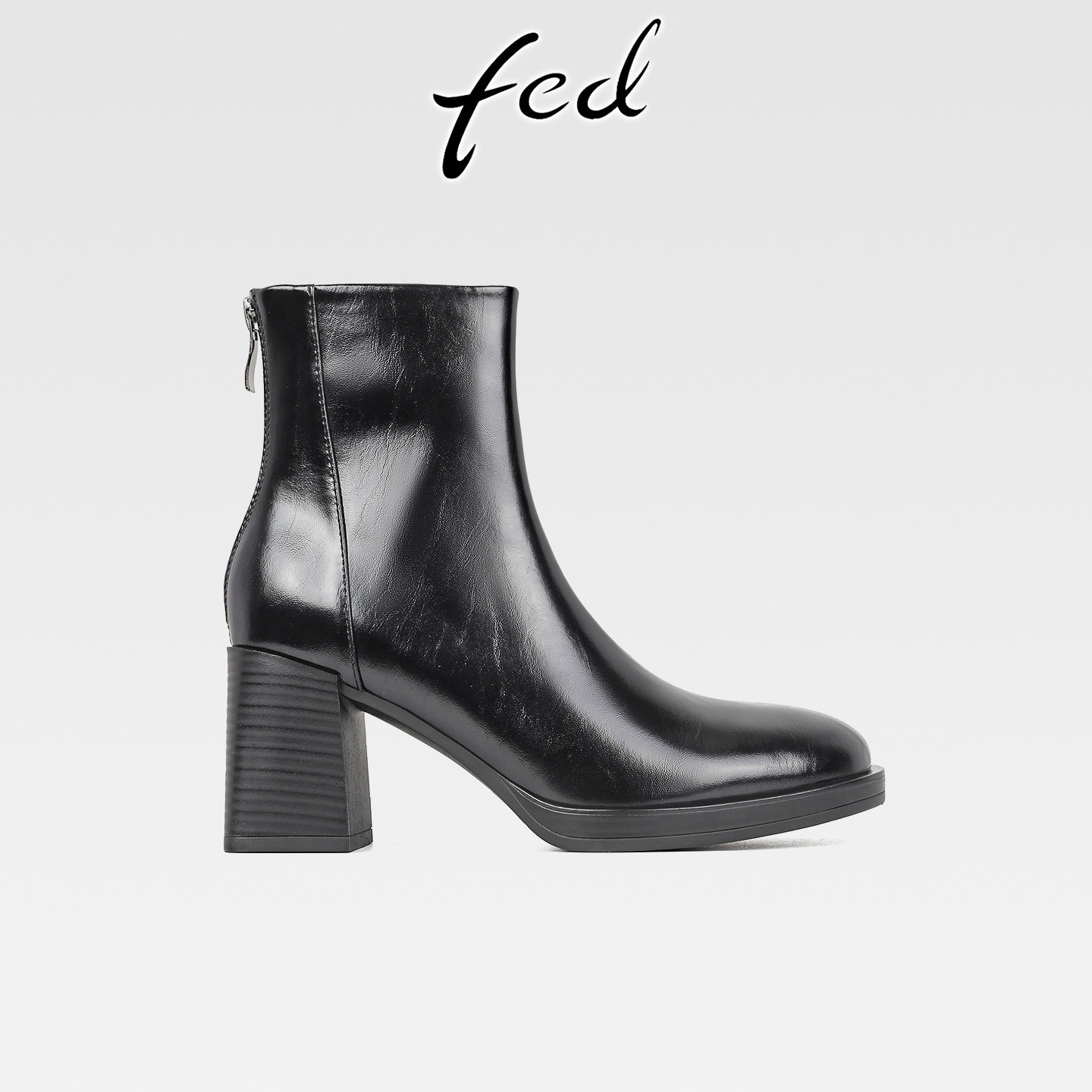fed复古真皮粗跟厚底瘦瘦靴女秋冬新款后拉链气质圆头高跟小短靴