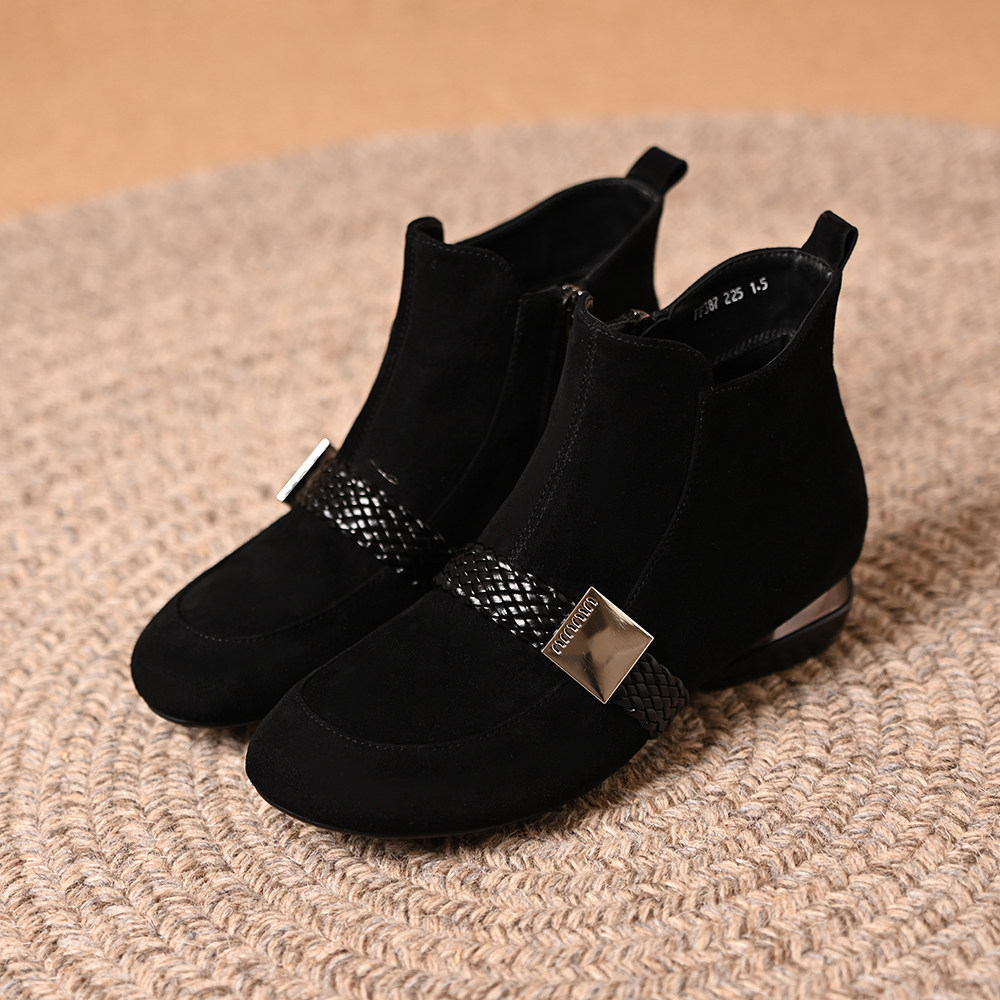 卓诗尼2025秋冬新款短靴女绒面圆头后拉链中跟时装靴粗跟马丁靴女