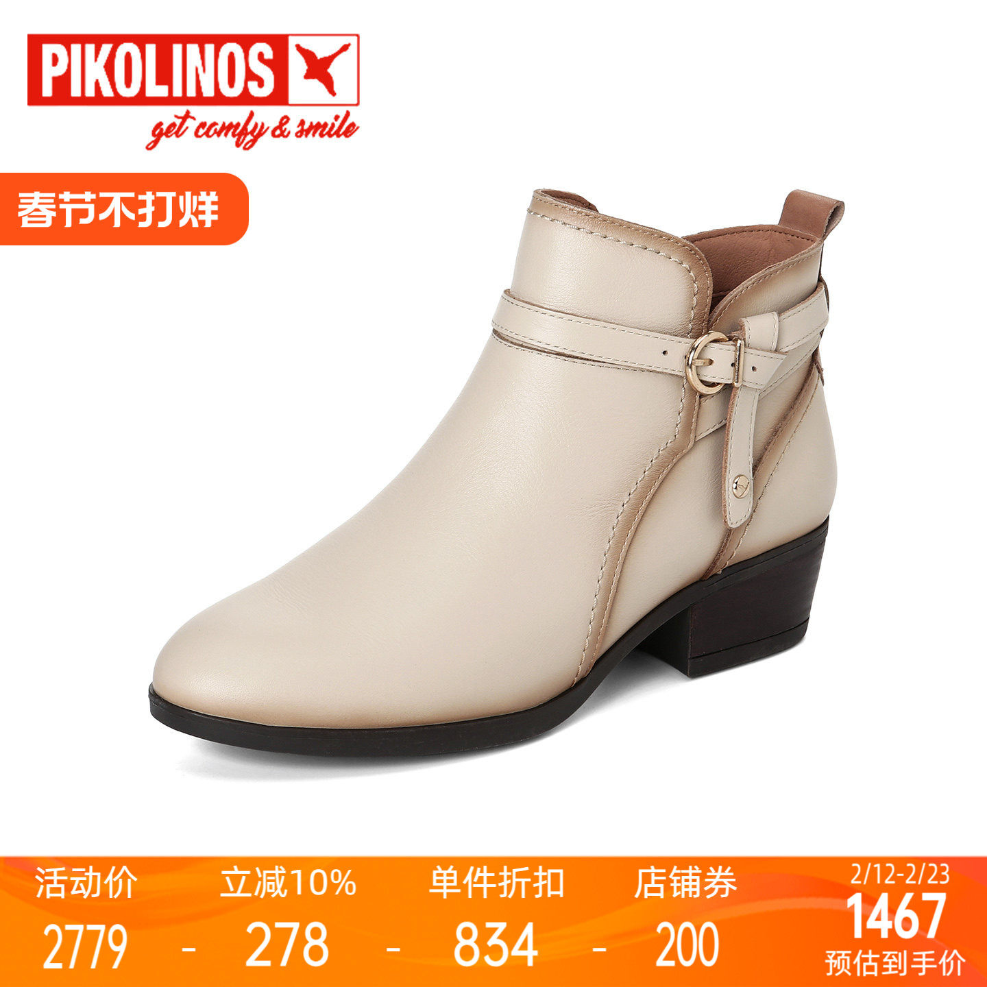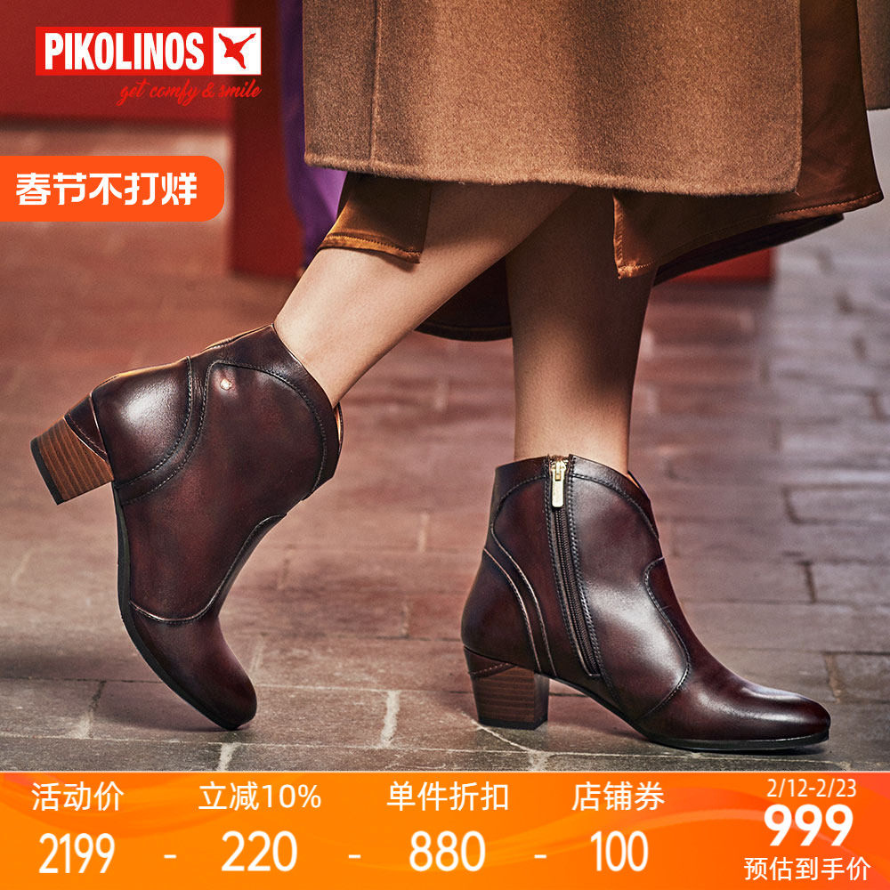 Pikolinos派高雁冬季牛皮圆头粗跟纯色侧拉链短靴PA251416