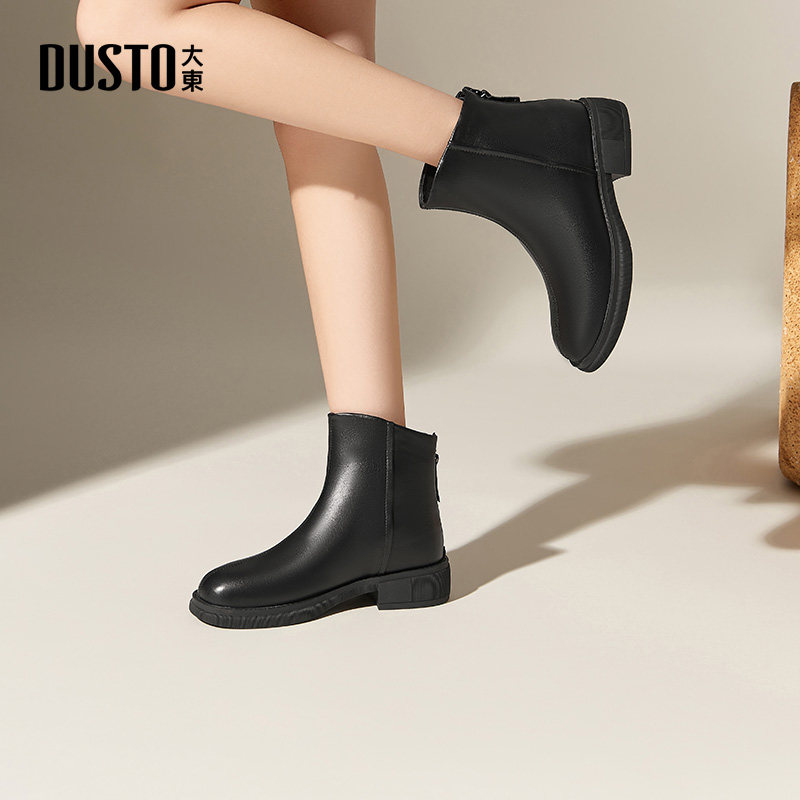 大东粗跟短靴女鞋冬季新款简约圆头车缝线中跟后拉链鞋D0200