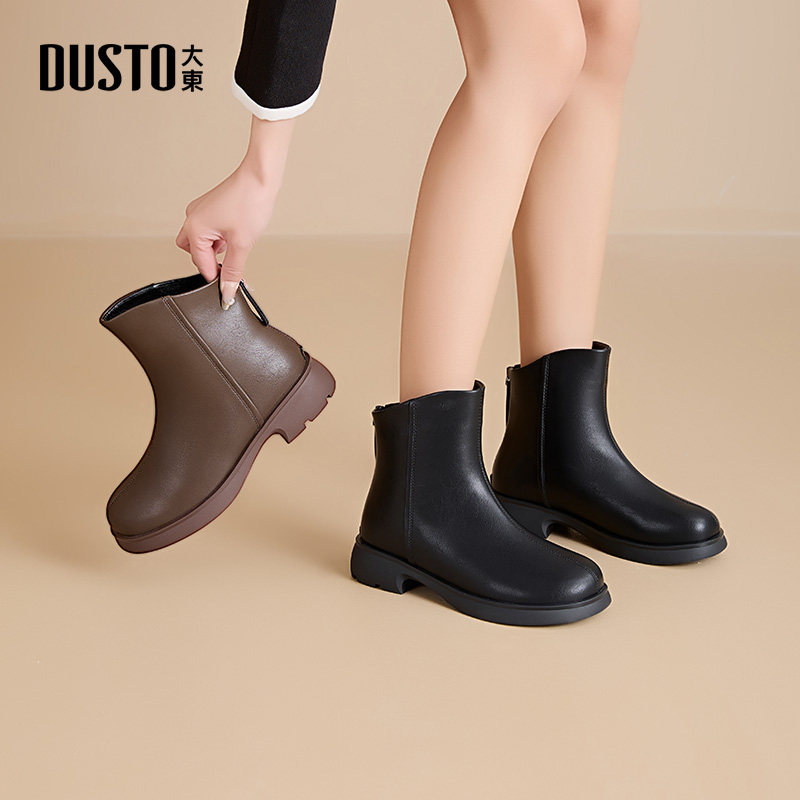 大东女短靴女鞋2025冬季新款时装靴圆头后拉链时尚粗跟厚底女靴子