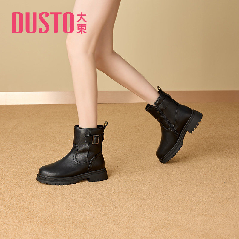 大东女靴时装靴2025冬季新款简约粗跟圆头女短靴侧拉链单里短筒靴